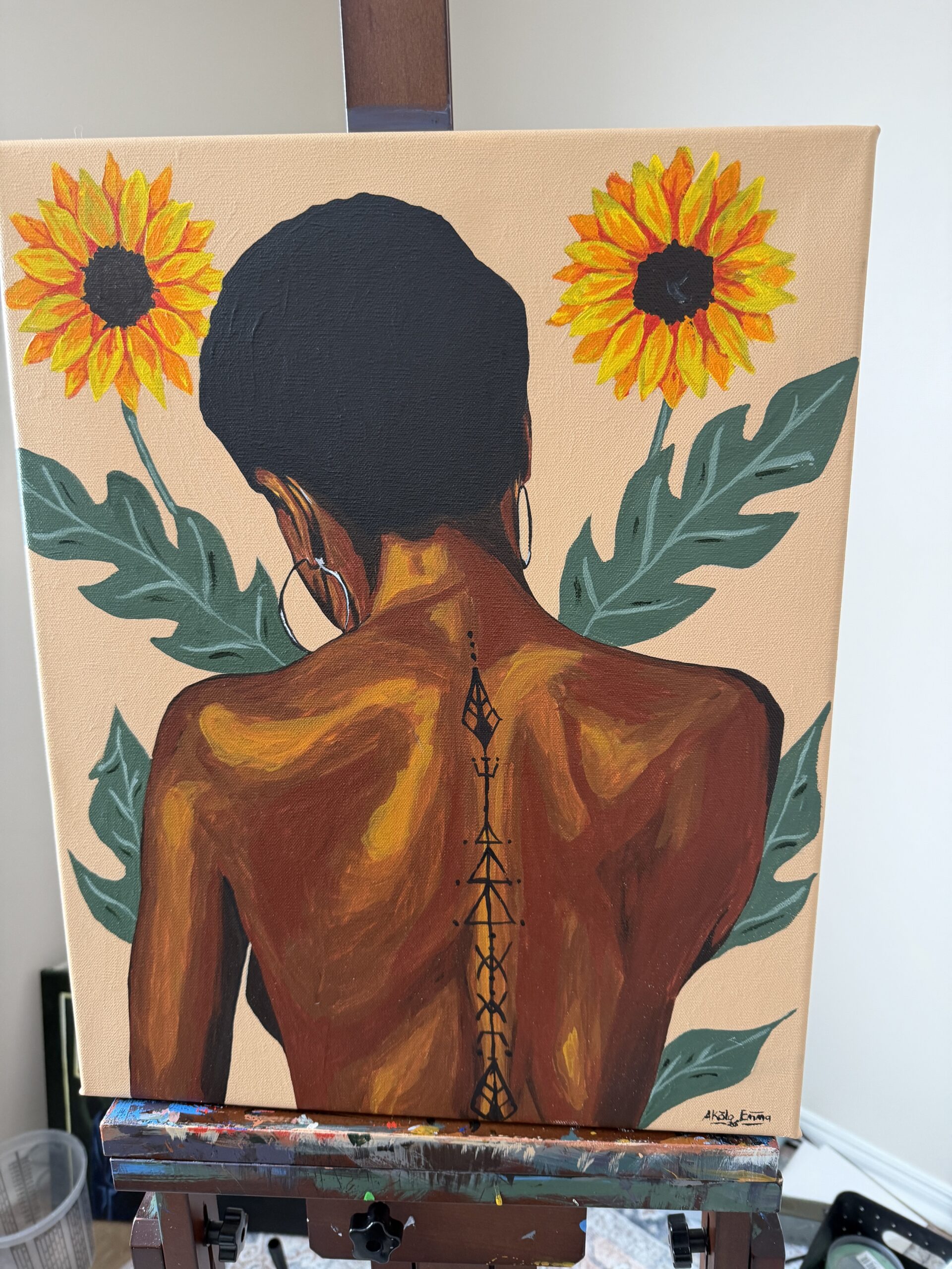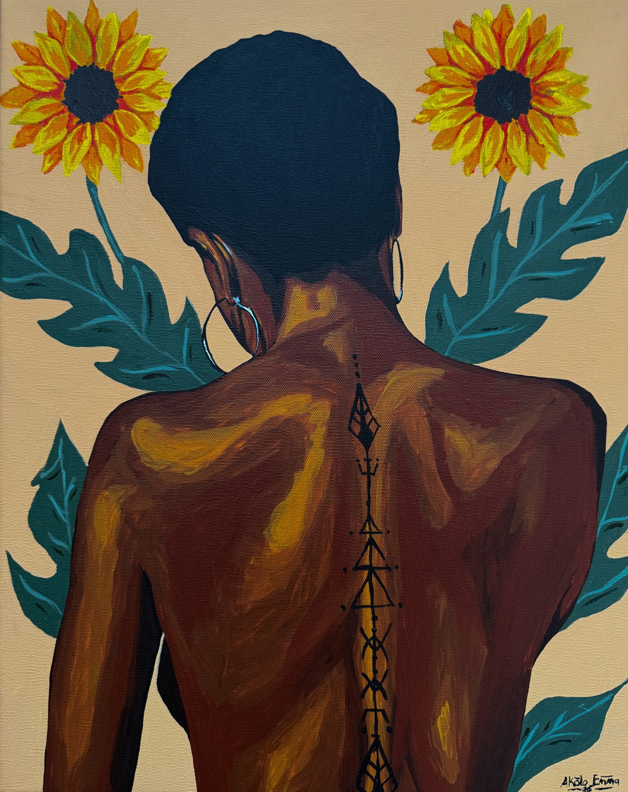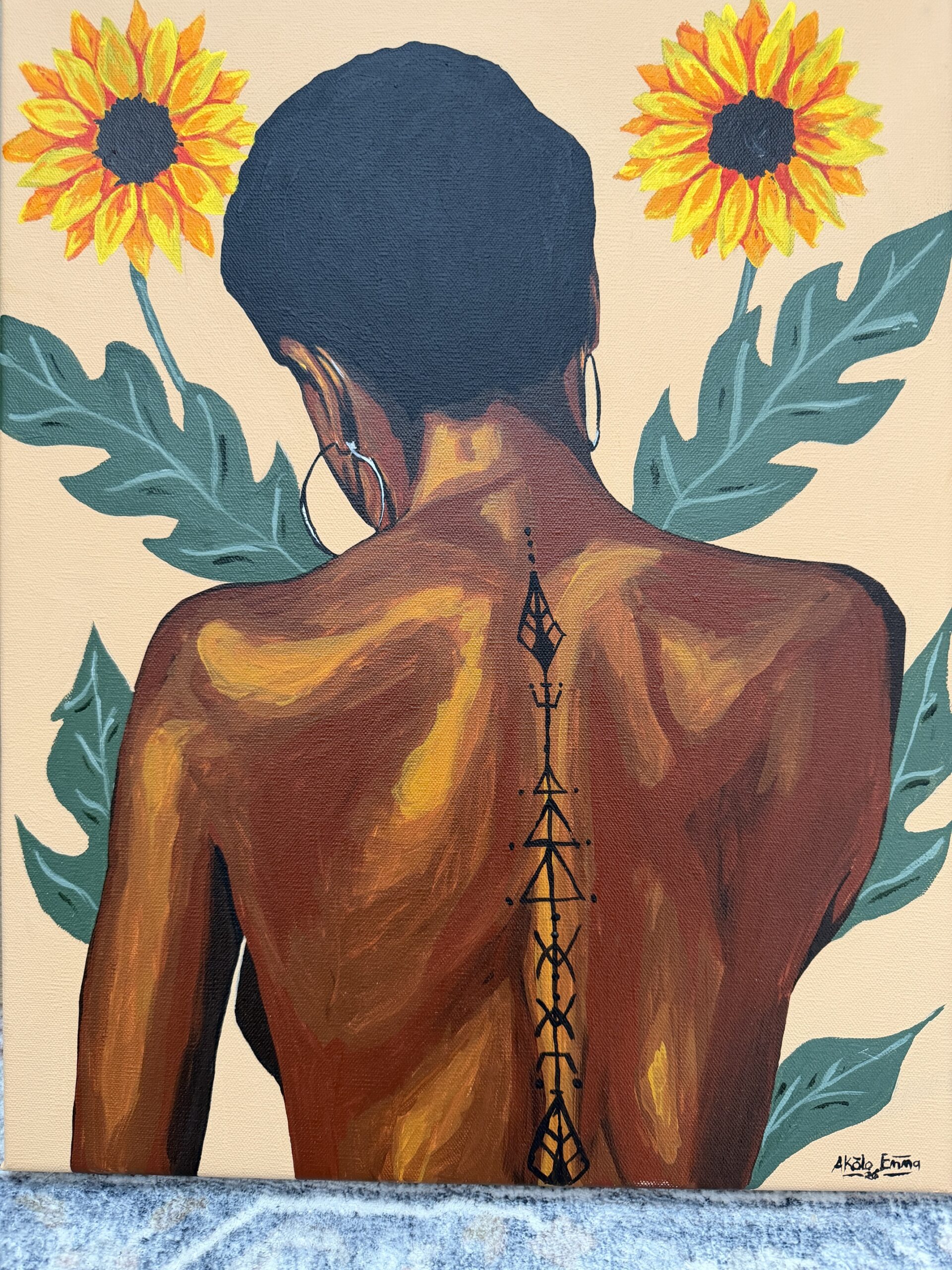 In A Meeting in the Garden, I explore the dissolution of boundaries between the human form and the botanical world. The two sunflowers are not merely plants, but living entities—figures with distinct presence standing in a quiet confrontation with the central subject. While her back is turned, she is deeply engaged in a private consultation with these “people” gathered in her presence. The subject serves as both the soil and the sun, her marked spine acting as a structural pillar for this secret assembly.