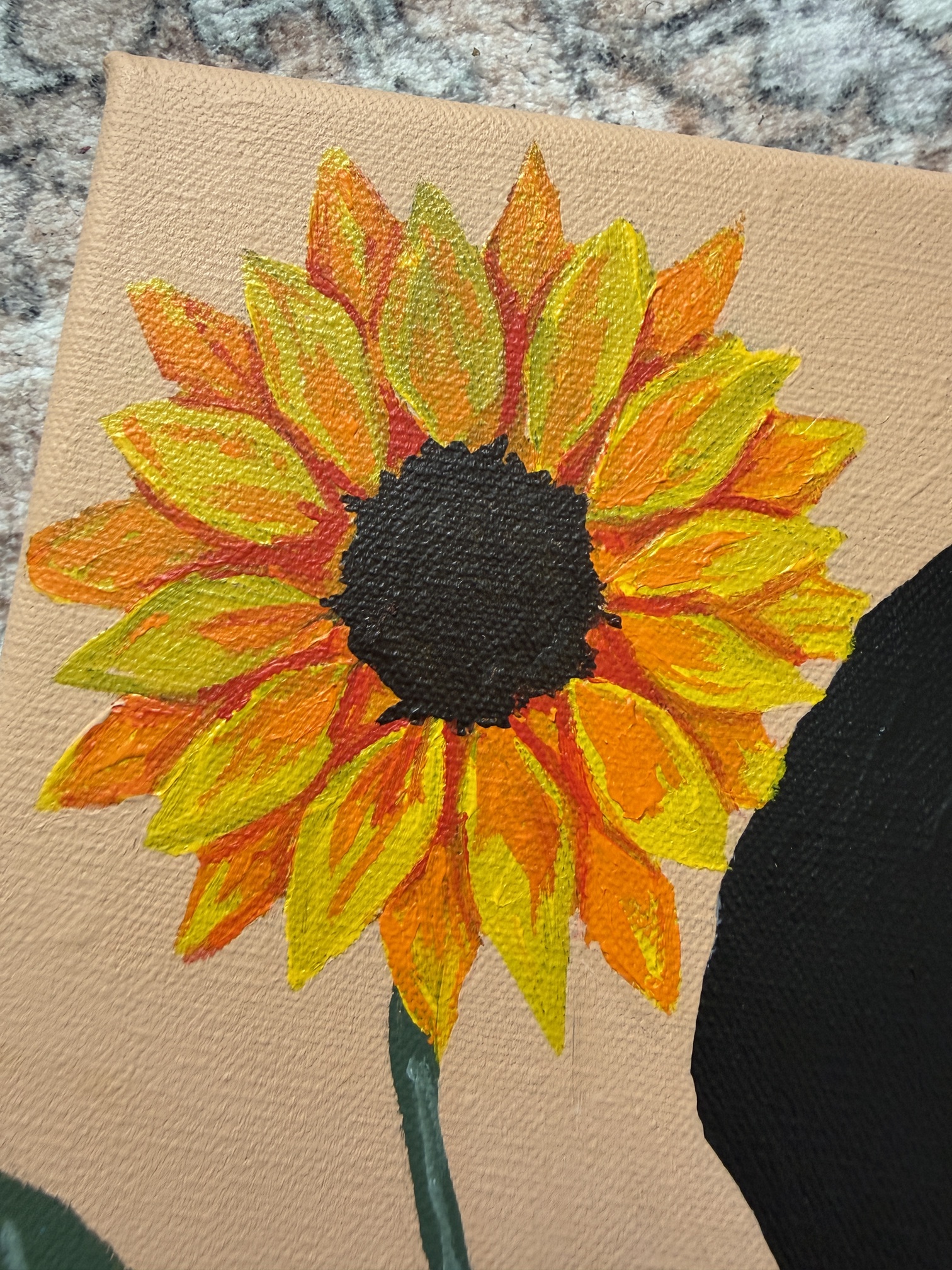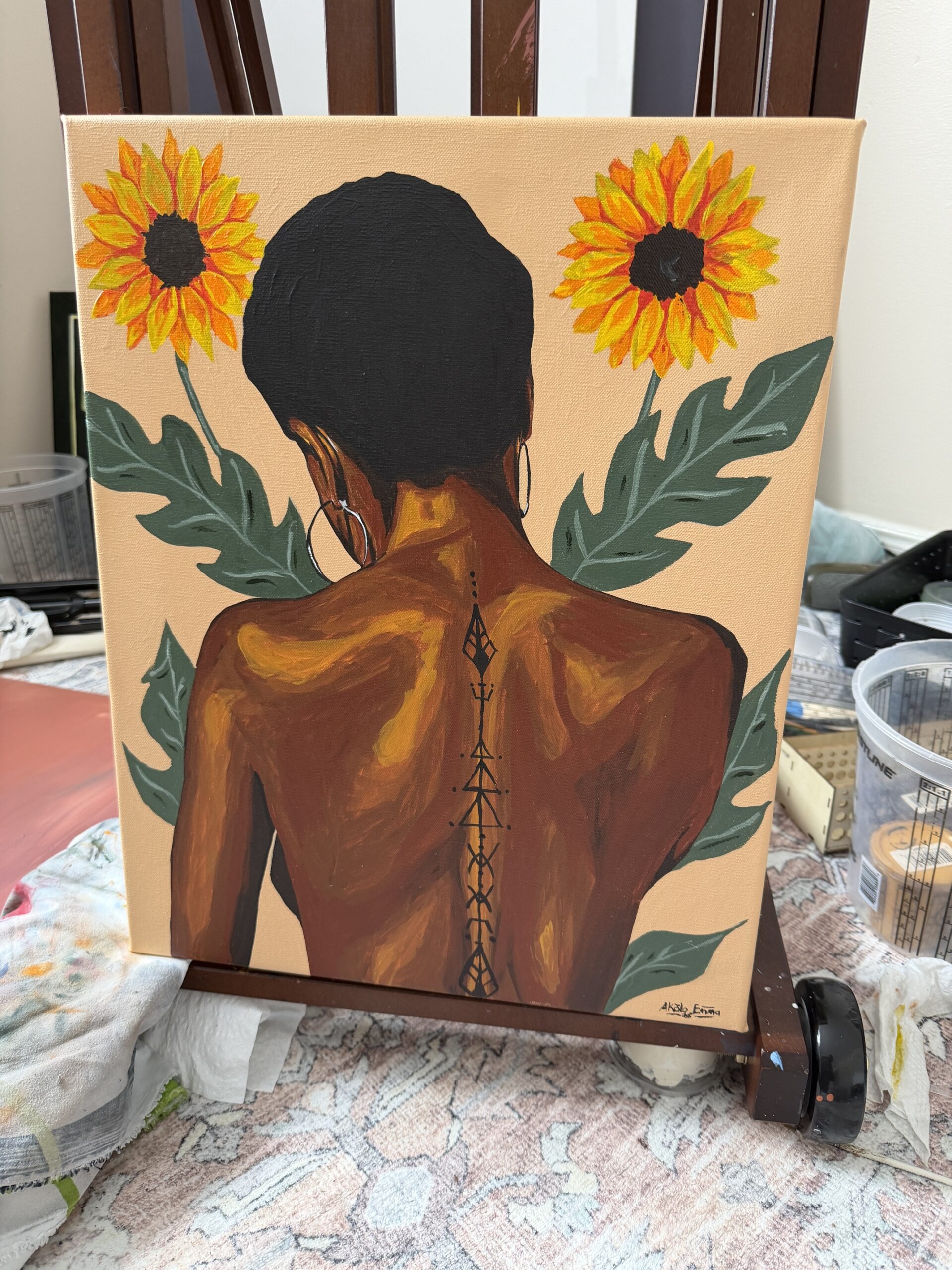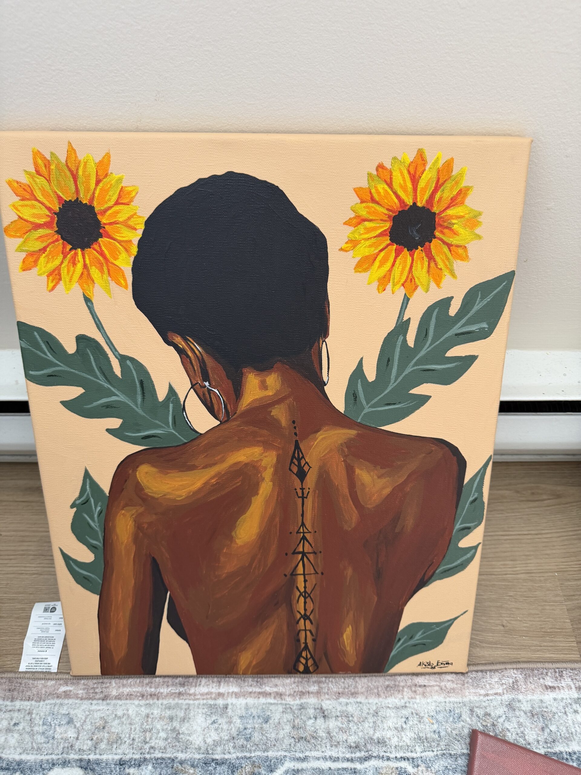 In A Meeting in the Garden, I explore the dissolution of boundaries between the human form and the botanical world. The two sunflowers are not merely plants, but living entities—figures with distinct presence standing in a quiet confrontation with the central subject. While her back is turned, she is deeply engaged in a private consultation with these “people” gathered in her presence. The subject serves as both the soil and the sun, her marked spine acting as a structural pillar for this secret assembly.