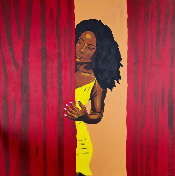 This painting speaks to the universal experience of preparing for a role, honoring the complexity and beauty that often remains hidden from view. The contrasting colors of yellow and red amplify the sense of drama and importance inherent in the reveal. “Behind the Curtains” celebrates the dignity of privacy and the powerful, deliberate decision to unveil oneself on one’s own terms.