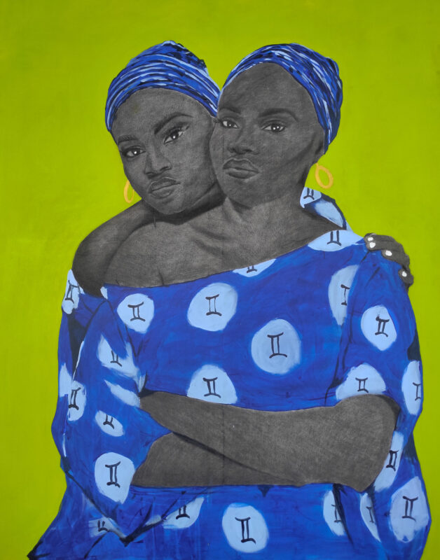 The work “Bond” is a vibrant, intense celebration of sisterhood, shared strength, and the power of mutual support. The two figures are depicted in close embrace, their heads aligned and one arm wrapped protectively around the other’s shoulder. Their matching, patterned clothing and shared, serious gazes reflect a deep, almost mirrored identity, emphasizing the inseparable nature of their connection.