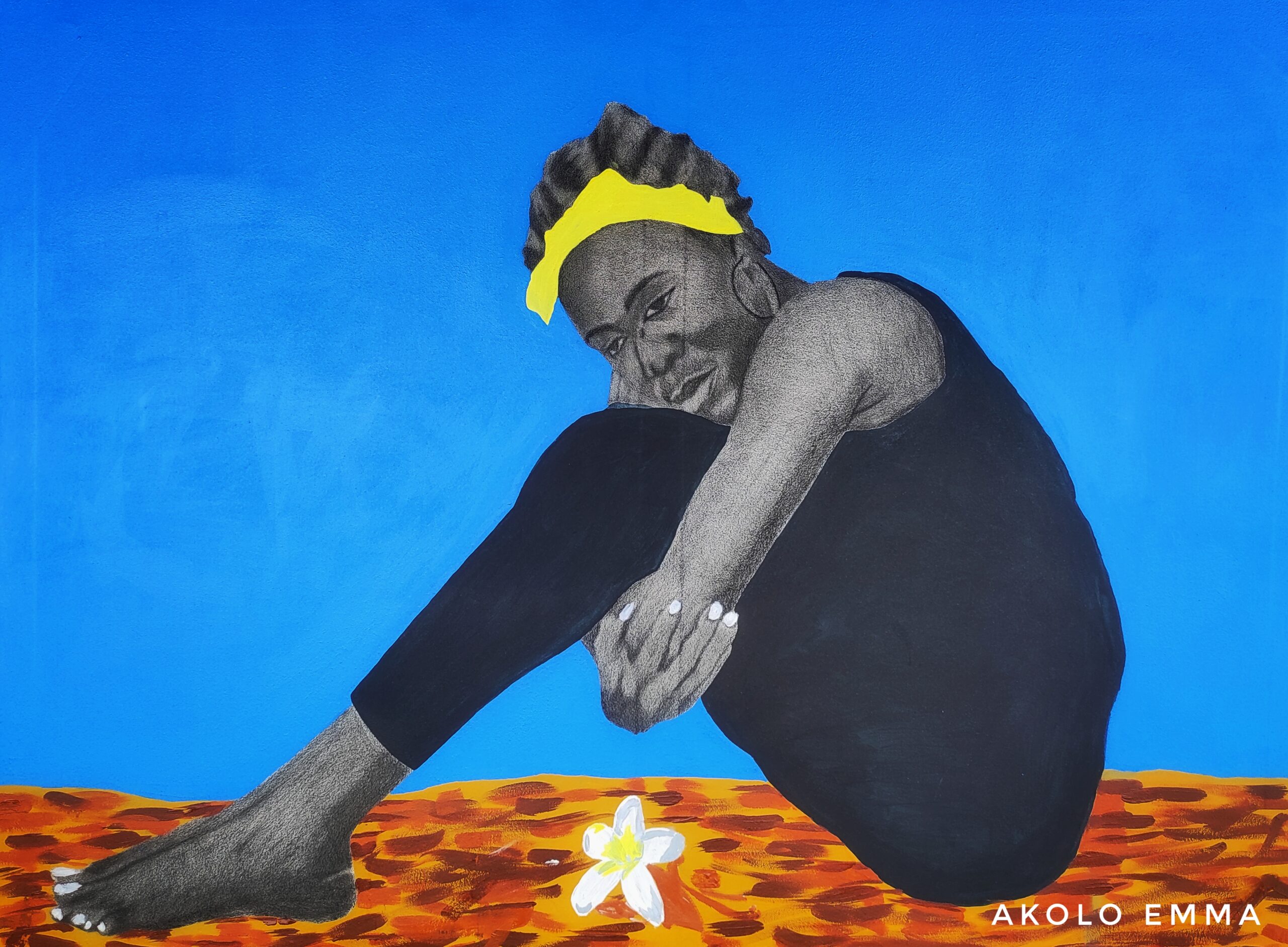 The work “Broken” is a raw, intimate exploration of emotional collapse and the vulnerability that follows profound pain. Rendered in stark black and white charcoal, the figure curls in on herself, a pose that signifies withdrawal, exhaustion, and the need for self-protection. The vibrant, active background of electric blue and turbulent orange heightens the sense of internal chaos surrounding her fragile state.