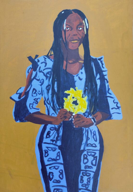 This painting speaks powerfully to the dignity found in embracing one’s own heritage; her patterned dress and elegant composure ground her in tradition, while her direct stare is entirely modern. The yellow flower she holds acts as a quiet counterpoint to her intensity, symbolizing a truth or beauty she is prepared to offer. “Her Gaze” celebrates the strength that radiates from a woman secure in her identity.