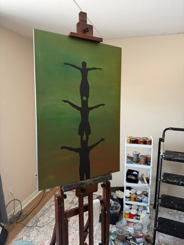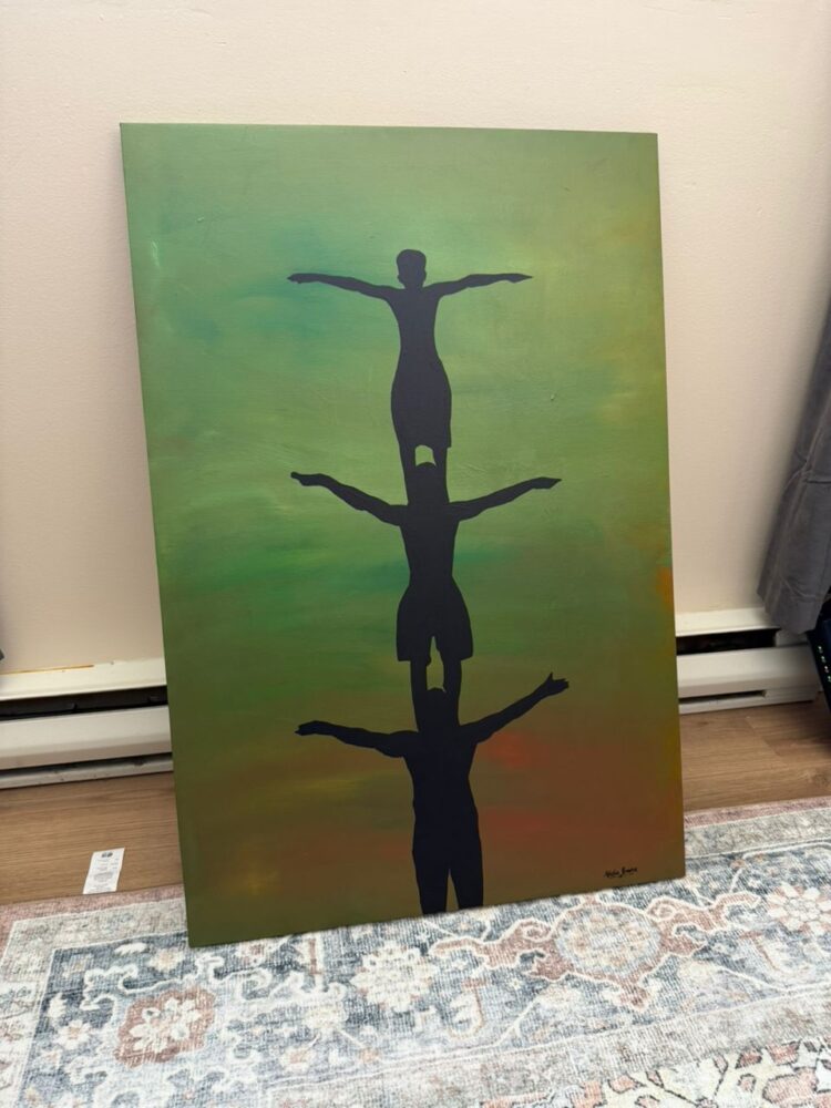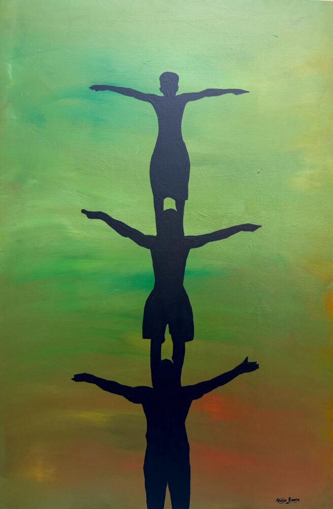 “I am, Because you are II” is a beautiful exploration of community and interdependence. This original acrylic painting on canvas delves into the artist’s evolving understanding of success as a collective endeavor. Balanced silhouettes evoke a sense of unity and the essential support systems that nurture individual growth. The textured background adds depth and intrigue to this contemporary, figurative piece.