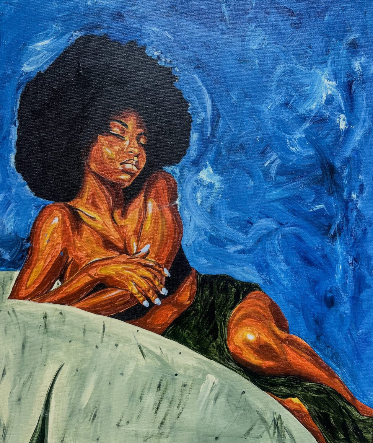 In this work, I celebrate the radiant power of stillness and the profound strength found in a moment of rest. I’ve rendered my subject with warm, golden tones to emphasize her internal glow, setting her against a turbulent, vivid blue background to highlight her unwavering calm amidst life’s movement. The bold, expressive brushstrokes are a deliberate choice to capture her confidence and self-assurance as a tangible force. This painting is my tribute to the beauty of being fully present within oneself—a state where peace is not merely the absence of noise, but a conscious, vibrant choice. Through the contrast of light and shadow on her form, I invite the viewer to witness a celebration of femininity and resilience. It is a visual documentation of that sacred space where we are no longer performing for the world, but simply existing, anchored and absolute, in our own element.