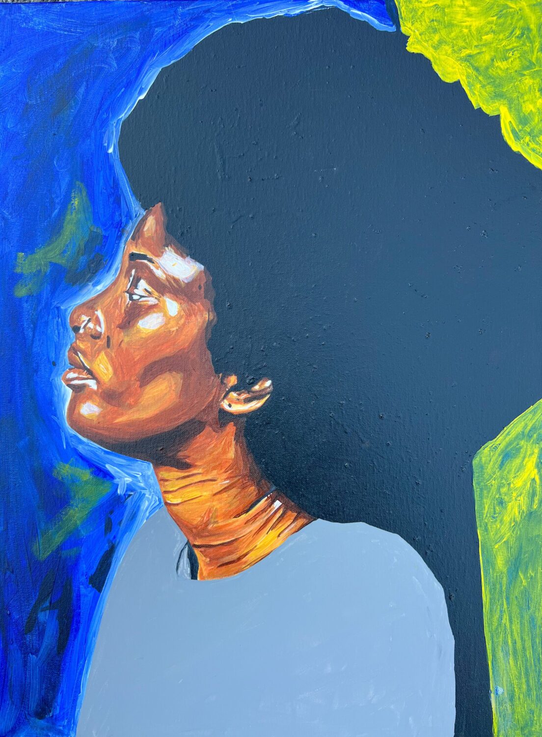 In this work, I explore the profound, unseen shifts that define our internal landscapes. I’ve utilized layered textures and bold, gestural strokes to map the tension between emotional control and the chaos of transformation. By placing a vast, dark silhouette against a turbulent blue and yellow background, I am illustrating the moments of unrest and vulnerability we often endure in silence. This piece reflects those subtle but powerful forces—the quiet quakes of the soul—that shape us as we navigate transitions we frequently suppress. Rather than offering a neat resolution, I invite you to sit within the discomfort of the “inner tremor” and recognize the raw beauty found in the process of becoming. It is a visual meditation on the fragmentation of the self and the resilience required to stay present through our own emotional unrest.