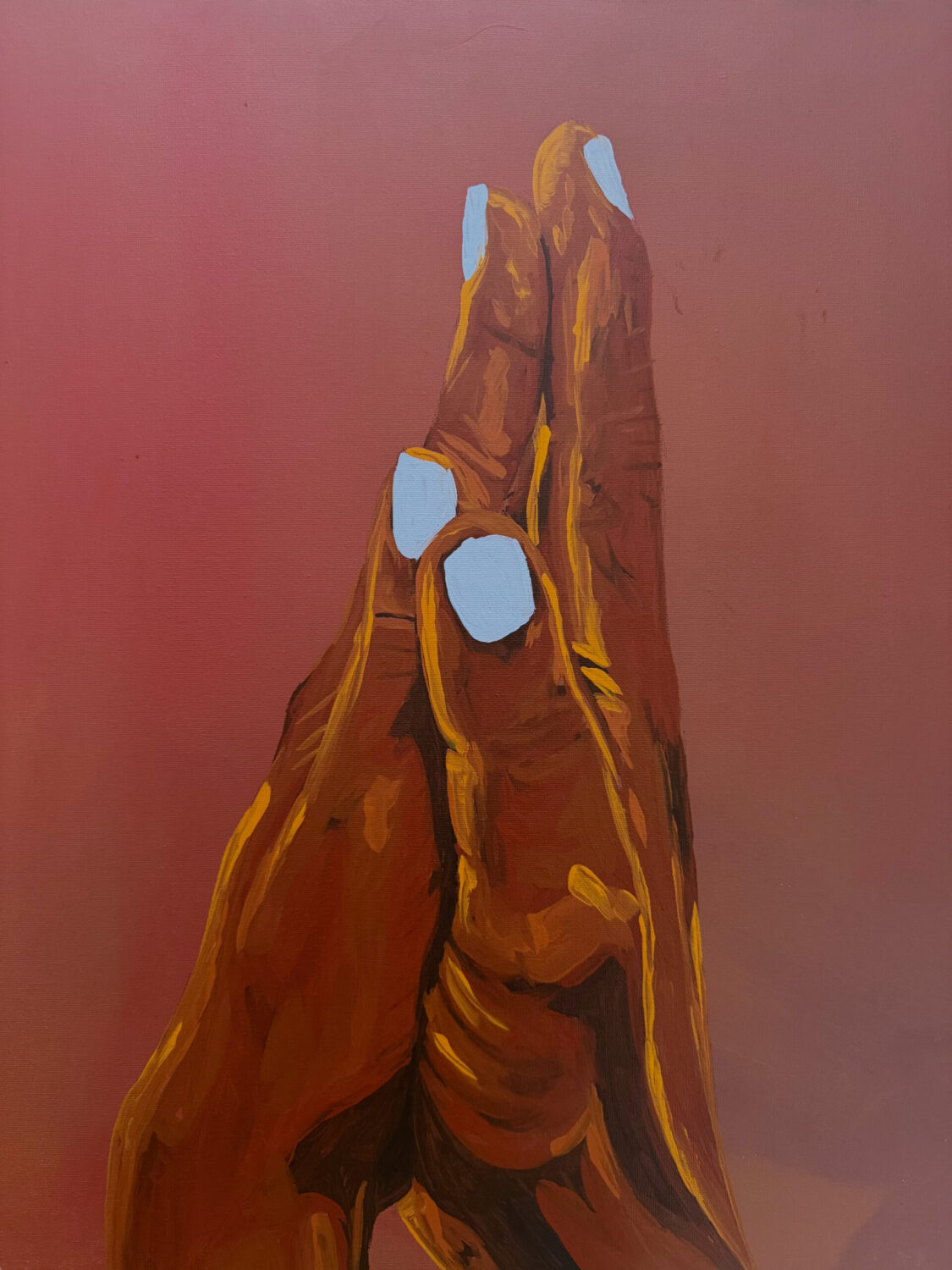 In this work, I delve into the sacred architecture of intimacy, merging the forms of two lovers into a single, ascending silhouette. I wanted to capture that profound moment where individual identities dissolve into a shared devotion, becoming a unified presence. Using a palette of warm, ochre skin tones against a muted, contemplative background, I aim to reflect the delicate balance between earthly passion and spiritual peace. The verticality of the hands suggests an upward reach—a prayer or a peak of connection that transcends the physical. Through expressive brushwork and conceptual figuration, I invite you to contemplate the duality of love and the sanctuary we build when two souls become intertwined. This painting is my meditation on the power of connection and the quiet, radiant strength found in true devotion.