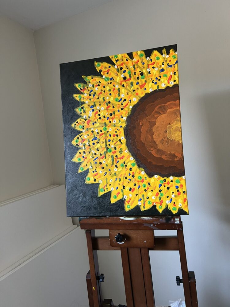 Joy in Bloom captures the essence of vitality and optimism through a radiant interpretation of the sunflower. The petals, painted in luminous yellow and alive with playful bursts of color, suggest movement and celebration, as though the flower itself is dancing in the light. The warm, earthy center provides balance, grounding the exuberant energy of the composition. This work speaks to the beauty of resilience and the joy found in life’s simple yet powerful expressions of growth and renewal.