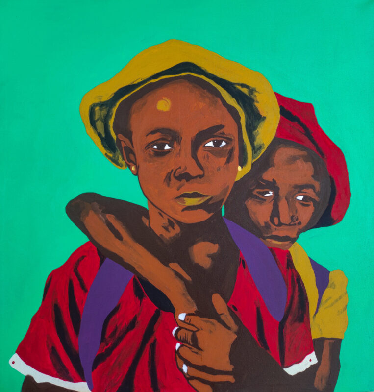 I painted Reckon to examine the sobering weight of responsibility often thrust upon the young. The composition features two children—one carrying the other—set against a vibrant, acidic green background that heightens the psychological tension of the scene. The central figure meets your gaze with a look of profound, aged maturity, signaling a quiet reckoning with a world that demands strength far beyond her years. This work explores the intersection of innocence and the early, heavy realization of communal duty.
