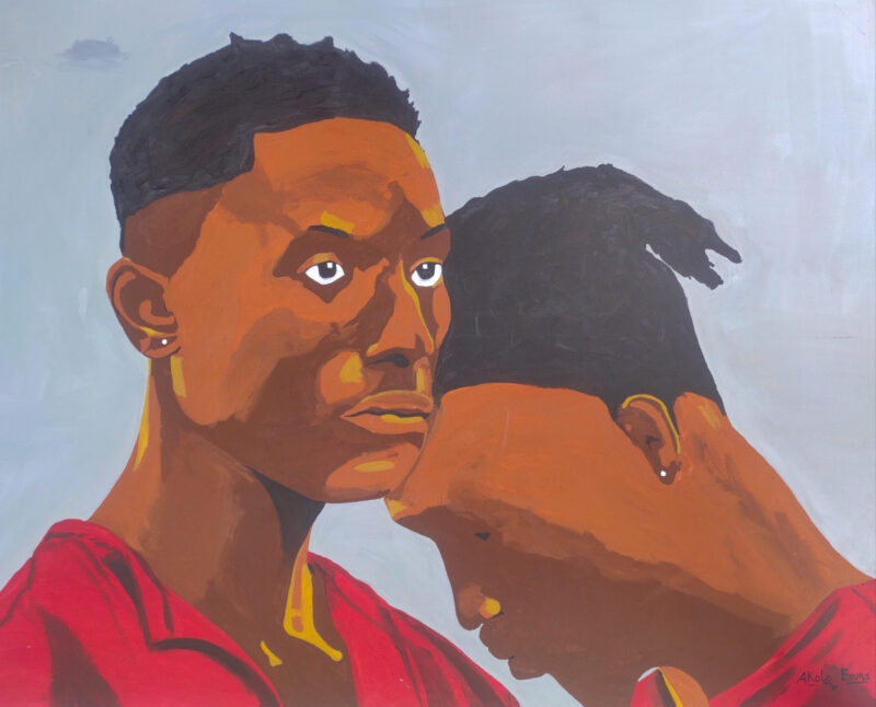 The work “The Confidant” explores the intensity and intimacy of absolute trust between two people, reflecting the spiritual calling to bear one another’s burdens. The figures are captured in a moment of extreme closeness, one leaning into the other with a gesture of silent reliance. The figure looking outward holds the viewer’s gaze with an intense, unwavering focus, acting as a watchful protector of the shared bond between them, mindful that they, too, could be tempted.