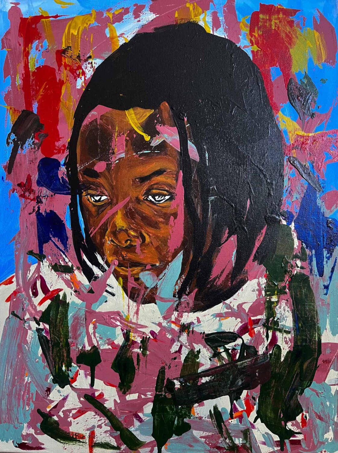 In this work, I explore the delicate balance between internal stillness and external turbulence. I’ve rendered a portrait that emerges from a field of bold, expressive strokes, symbolizing a sense of resilience and identity persisting amidst disorder. The vibrant, chaotic application of pink, red, and deep green represents life’s inherent unpredictability, while the subject’s steady gaze acts as an anchor within the frame. By allowing the paint to partially obscure the figure, I am documenting the way our surroundings often overlap with our sense of self. This piece is my invitation to find beauty and a centered calm even when the world feels fragmented. It is a visual testament to the strength required to remain present and whole while navigating the “chaos” that constantly swirls around us. I want the viewer to feel the energy of the movement and the quiet power of the soul that refuses to be lost in the noise.